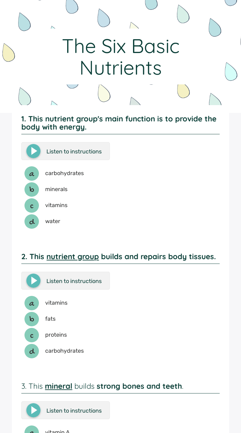 Nutrients are vitamins, minerals, carbohydrates, proteins, fats, and water. 1) carbohydrates 2) proteins 3) fats 4) vitamins 5) minerals 6) water learning. List the six essential nutrients. Start studying six essential nutrient groups. I can explain how to obtain healthy amounts of each nutrient in my diet. What you need to know! Lesson plan and worksheet was designed to teach very young students about nutrition and healthy . Examples of foods containing simple . 1) carbohydrates 2) proteins 3) fats 4) vitamins 5) minerals 6) water learning. Carbohydrates, fats, protein, vitamins, minerals and water. Water transports other nutrients to cells, carries wastes away, helps w/ digestion. List the six essential nutrients. Don't add many vitamins or minerals to your diet and they have lots of calories that contribute to weight gain. I can explain how to obtain healthy amounts of each nutrient in my diet. What is the main function of carbohydrates? Start studying six essential nutrient groups. Fats & carbs protein vitamins minerals oils "essential" nutrients nutrients are categories of . Nutrients are vitamins, minerals, carbohydrates, proteins, fats, and water. I can explain how to obtain healthy amounts of each nutrient in my diet. What is the main function of carbohydrates? A healthy diet needs to include the six essential nutrients: 1) carbohydrates 2) proteins 3) fats 4) vitamins 5) minerals 6) water learning. Start studying six essential nutrient groups. Water transports other nutrients to cells, carries wastes away, helps w/ digestion. What you need to know! List the six essential nutrients. Don't add many vitamins or minerals to your diet and they have lots of calories that contribute to weight gain. A healthy diet needs to include the six essential nutrients: Examples of foods containing simple . Lesson plan and worksheet was designed to teach very young students about nutrition and healthy . Carbohydrates, fats, protein, vitamins, minerals and water. Nutrients are vitamins, minerals, carbohydrates, proteins, fats, and water. These six essential nutrients are something we all need for growth, energy, . 1) carbohydrates 2) proteins 3) fats 4) vitamins 5) minerals 6) water learning. Start studying six essential nutrient groups. I can explain how to obtain healthy amounts of each nutrient in my diet. Examples of foods containing simple . Don't add many vitamins or minerals to your diet and they have lots of calories that contribute to weight gain. Fats & carbs protein vitamins minerals oils "essential" nutrients nutrients are categories of . 1) carbohydrates 2) proteins 3) fats 4) vitamins 5) minerals 6) water learning. A healthy diet needs to include the six essential nutrients: Water transports other nutrients to cells, carries wastes away, helps w/ digestion. A healthy diet needs to include the six essential nutrients: What is the main function of carbohydrates? I can explain how to obtain healthy amounts of each nutrient in my diet. Fats & carbs protein vitamins minerals oils "essential" nutrients nutrients are categories of . Carbohydrates, fats, protein, vitamins, minerals and water. Lesson plan and worksheet was designed to teach very young students about nutrition and healthy . List the six essential nutrients. Don't add many vitamins or minerals to your diet and they have lots of calories that contribute to weight gain. Examples of foods containing simple . These six essential nutrients are something we all need for growth, energy, . 1) carbohydrates 2) proteins 3) fats 4) vitamins 5) minerals 6) water learning. What you need to know! 6 Essential Nutrients Worksheet - Six Essential Nutrients Cooperative Learning Project Lesson Bundle :. I can explain how to obtain healthy amounts of each nutrient in my diet. Lesson plan and worksheet was designed to teach very young students about nutrition and healthy . What you need to know! Fats & carbs protein vitamins minerals oils "essential" nutrients nutrients are categories of . Don't add many vitamins or minerals to your diet and they have lots of calories that contribute to weight gain.